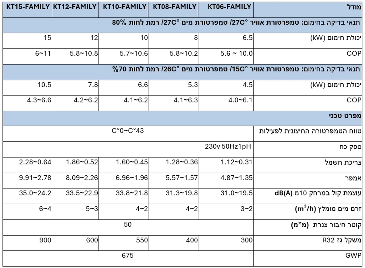 - – משאבת החום KT-Family תעזור לך להפחית את חשבון החשמל שלך בשיעור של עד 45% בהשוואה לכל דגם ON/OFF אחר.