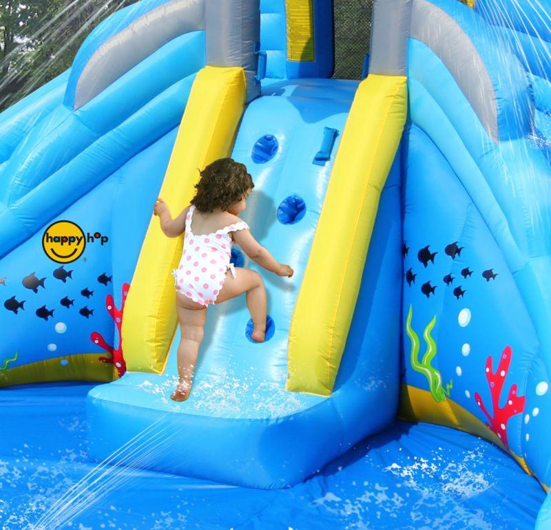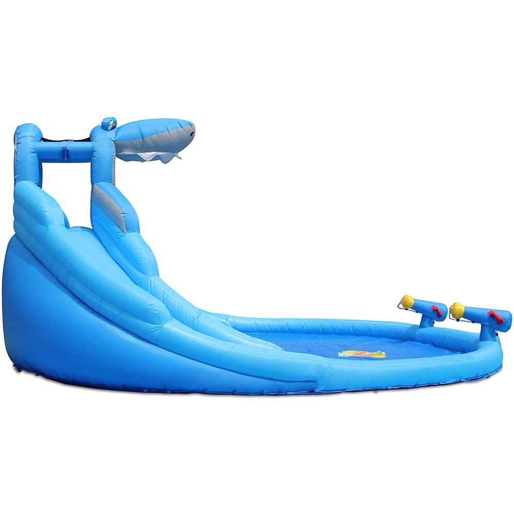 מגלשת מים כפולת מסלולים עם בריכת שכשוך ושני תותחי מים.